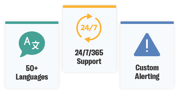Our fully managed service seamlessly scales to meet your needs, providing uninterrupted brand protection even during critical events. This ensures your social media teams can stay focused on their core tasks. Our team of industry specialists offers enhanced security, best practices for nuanced risk coverage in over 50 languages, and custom alerting for immediate action. Enjoy 24/7/365 global coverage for complete peace of mind.