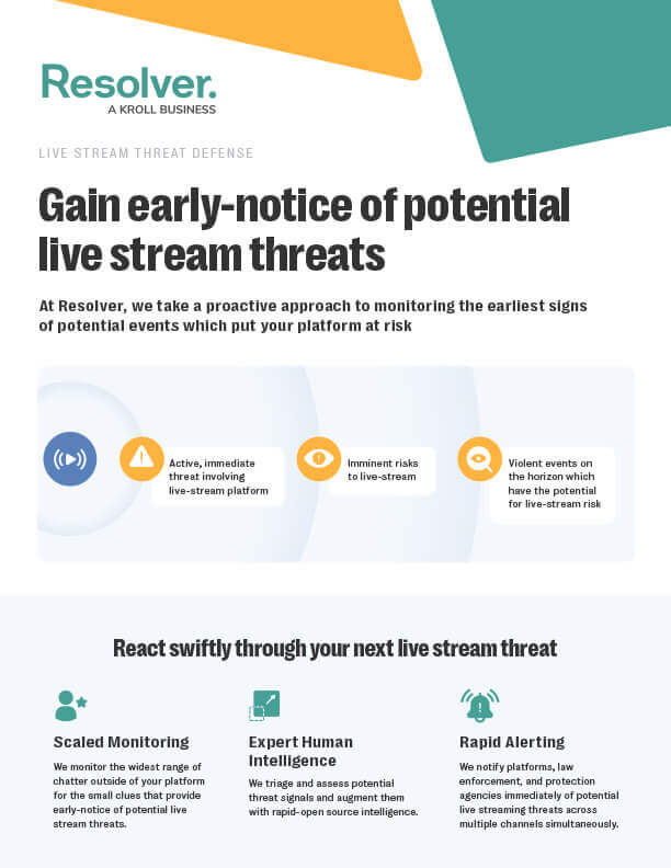 Resolver monitors the widest range of sources for the small clues that provide early-notice of potential live stream threats. Leveraging both AI and a dedicated 24/7/365 human analyst team, potential threat signals are assessed, triaged, and augmented with rapid open-source intelligence.