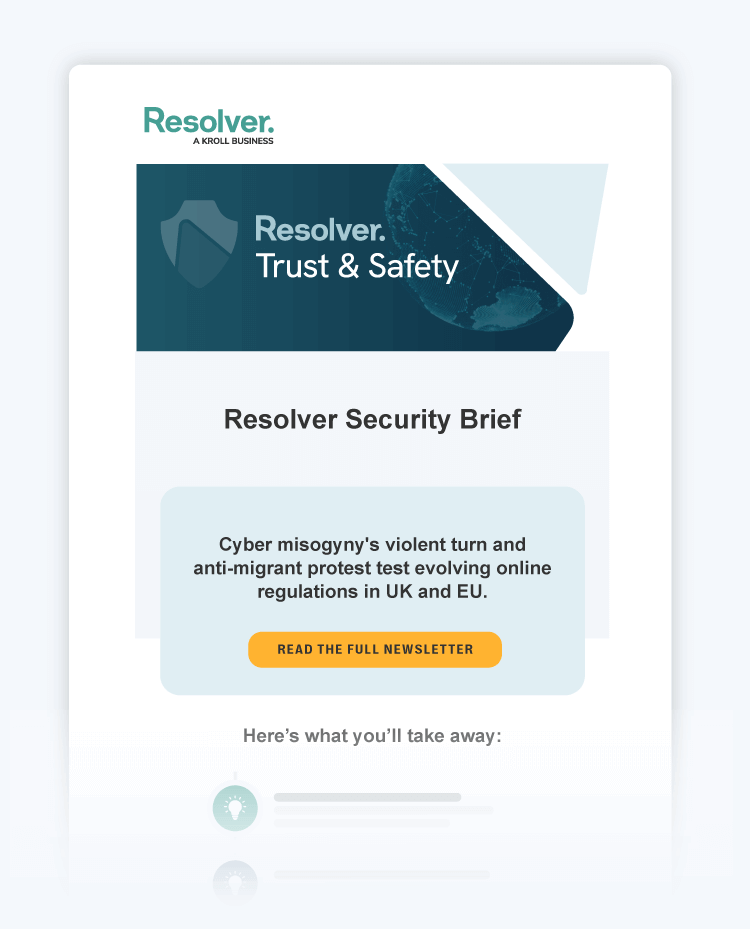 At Resolver, we believe knowledge is power. That’s why we provide a free, monthly brief to help Trust & Safety teams identify threats and assess risks.